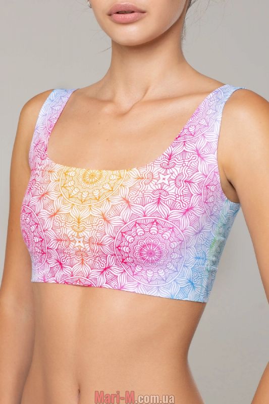 Комплект топ и одни трусики. Для комплектации доступны три вида трусиков, ссылки на модели трусиков на странице ниже. Модель трусиков для комплектации необходимо указать в корзине, в окошке для примечаний. Бесшовный топ Crop Top MANDALA HAPPINESS Mememe. Комфортный мягкий топ из гладкой, эластичной и очень нежной ткани с многоцветным принтом с изображением мандалы. Модель без выделенных чашечек, косточек и застежек, с широкими эластичными бретелями. Плоские швы, незаметные под одеждой. Обработка краев – без резинок, которые врезаются в кожу. Топ пропускает воздух, быстро сохнет, сохраняет форму и яркость цветов после многократных стирок. Принты наносятся современным безопасным методом сублимационной печати. Состав: 83% полиэстер, 17% эластан.