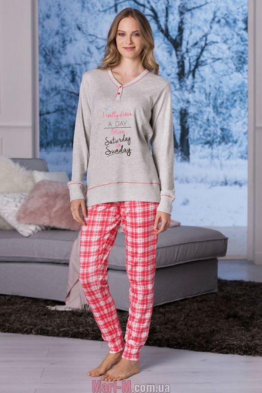 Песочная женская хлопковая пижама DD861 Cotonella. Симпатичная пижама для прохладных вечеров, состоящая из однотонной футболки свободного кроя и зауженных к низу брюк. Футболка - с полукруглым вырезом и пуговицами на планке, с длинными рукавами. По краю рукавов и по низу футболки притачные манжеты и пояс. На груди - надпись. Брюки в клетку на широкой мягкой резинке с манжетами по низу. Комплект выполнен из натурального гипоаллергенного материала, обладающего высокой гигроскопичностью и не вызывающего аллергии. Расцветка как на фото. Состав: 100% хлопок.