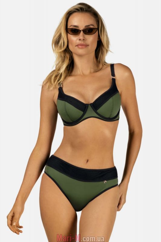 Раздельный купальник F05A 633 Feba. Раздельный купальник цвета хаки, декорированный вставками из черной сетки. Уплотненные чашечки на косточках хорошо поддерживает грудь больших размеров и придают ей красивую округлую форму благодаря вертикальному сечению. Чашечки полудублированные – нижняя часть из тонкого поролона, верхняя из мягкой ткани. Модель на подкладке из стабилизирующей сетки. Широкие плечевые бретели не отстегиваются, регулируются по длине. На спине застежка. В комплекте плавки слипы с завышенной линией талии, на подкладке. Состав: 80% полиамид, 20% эластан.