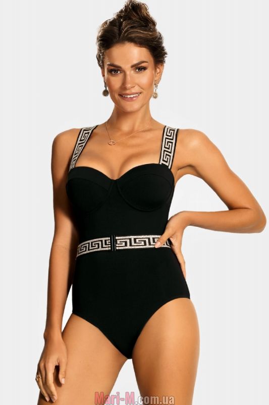 Слитный купальник Versace FL28 876 Feba. Роскошный слитный купальник в базовом черном цвете с акцентом в виде широких декоративных бретелей и поясом с графичным золотистым узором в стиле модного дома Версаче. Выполнен из высококачественной эластичной быстросохнущей ткани, устойчивой к воздействию УФ-лучей и хлора. Лиф балконет с поролоновыми чашечками с эффектом пуш-ап на каркасах хорошо поддерживает грудь и формирует эффектное декольте. Широкие эластичные бретели без регулировки. Спинка закрытая. Талию подчеркивает широкий съемный эластичный пояс. Состав: 80% полиамид, 20% эластан.