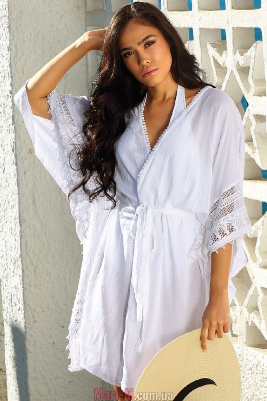 Пляжная туника F178 645 Feba. Воздушная легкая туника-халат из однотонного белого вискозного полотна, отделанная широким ажурным кружевом в тон. Модель кроя кимоно, на запах под пояс, с широкими рукавами ¾ «летучая мышь», длиной выше колен. Вырез отделан ажурной тесьмой. Состав: 100% вискоза. Шляпа в комплект не входит. Её можно приобрести отдельно, по ссылке ниже на странице, в товарах Для комплектации.