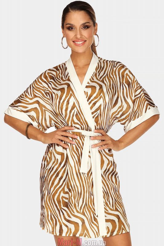 Пляжная туника Safari F180 820 Feba. Пляжная туника из легкого полупрозрачного материала с анималистичным принтом «под зебру» в золотисто-коричневых тонах. Модель на запах под пояс, с широкими рукавами-кимоно длиной до локтя. Полочки и рукава отделаны широким однотонным кантом. Состав: 97% полиэстер, 3% эластан.