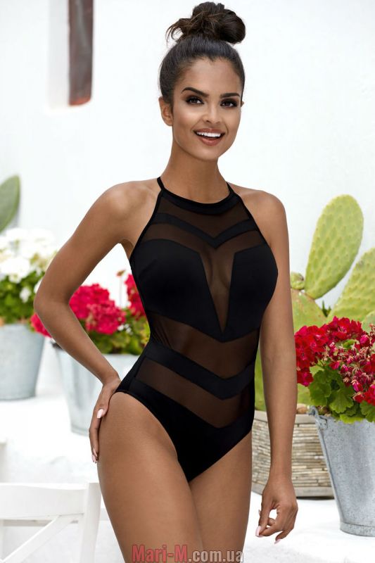 Слитный купальник L4357 Lorin. Слитный купальник в классическом черном цвете, декорированный вставками из микросетки. Лиф мягкий, с закрытым декольте, тонкая бретель застёгивается на шее сзади, к ней крепятся широкие эластичные бретели на спинке.