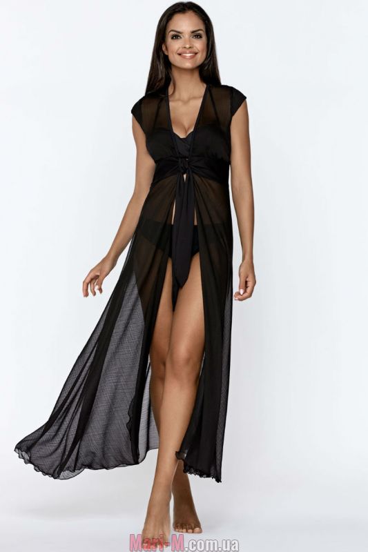 Длинная пляжная туника L6017 Lorin. Элегантная и легкая пляжная туника макси. Модель с глубоким V-образным вырезом. Завязывается под грудью. Широкий пояс и короткие рукава-крылышки выполнены из более плотного непрозрачного материала.
