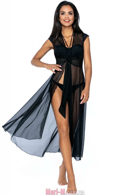 Прозрачная пляжная туника с ажурным поясом L6027 Lorin. Длинная пляжная туника из прозрачной микросетки. Модель с глубоким V-образным вырезом и широким ажурным поясом, переходящим в завязки под грудью.