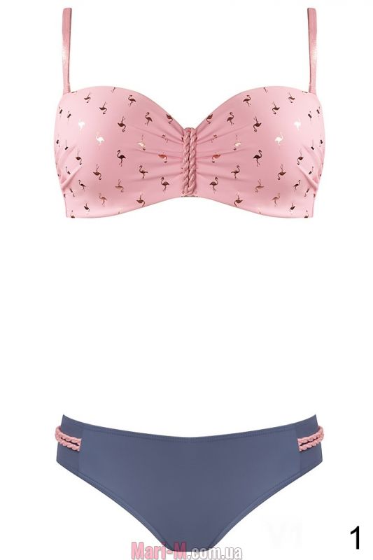 Раздельный купальник S730J20-1 Self. Элегантный и женственный раздельный купальник с оригинальным золотистым принтом с миниатюрным изображением фламинго. Бюстгальтер-балконет с плотными формованными чашечками на косточках с вкладками пуш-ап, между чашечками декор в виде витого шнура. Тонкие бретели отстегиваются и регулируются по длине. На спине застежка. Классические однотонные плавки слипы с комфортной посадкой и бочками средней ширины декорированы витым шнуром по бокам.