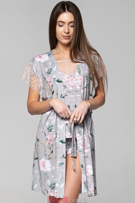 Халат из вискозы с кружевом 2221/1 Shato. Халат выполнен из мягкого вискозного полотна с принтом в виде цветов и птиц. Модель на запах под пояс, короткие рукава декорированы нежным кружевом с волнистым краем и ресничками. Состав: 95% вискоза, 5% эластан. Сорочка и пижама в комплект не входят. Их можно приобрести по ссылке ниже на странице, в товарах Для комплектации.