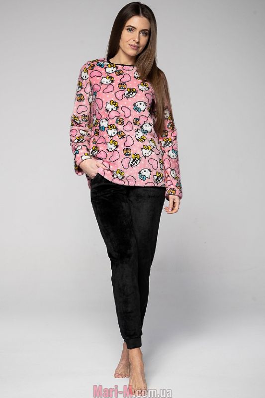 Пижама из флиса и велюра 1330 Wiktoria. Теплая уютная женская пижама. Комплект состоит из пушистой флисовой кофты с ярким принтом в стиле «Hello Kitty» и однотонных велюровых брюк. Кофта свободного кроя, с неглубоким круглым вырезом горловины. Брюки зауженные к низу, штанины с манжетами, в поясе мягкая резинка, по бокам карманы. Состав: 100% полиэстер.