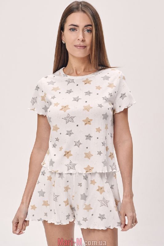 Хлопковая пижама с шортами 1612 Wiktoria. Пижама выполнена из мягкого эластичного хлопкового трикотажа в рубчик с принтом в виде звезд. В комплект входит футболка с короткими рукавами и короткие свободные шорты на мягкой резинке в поясе. Неглубокий круглый вырез горловины отделан кантом. Шорты, футболка и рукава по низу имеют волнистый край с отделкой плоским швом. Состав: 95% хлопок, 5% эластан.