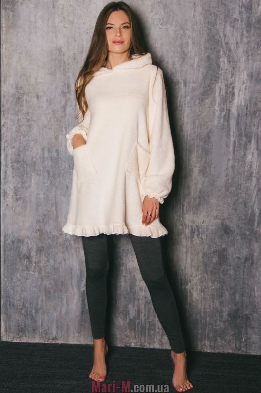 Теплая пижама/комплект для дома из флиса 710 Wiktoria. Стильный и комфортный домашний комплект. В комплект входит туника с капюшоном и леггинсы. Туника свободного кроя, с глубоким капюшоном, длинные широкие рукава присобраны на запястьях и украшены оборками. По низу изделие также декорировано пышной оборкой. По бокам – накладные карманы. Леггинсы на мягкой резинке в поясе. Комплект подойдет как для сна, так и для отдыха дома. Состав: 100% полиэстер.