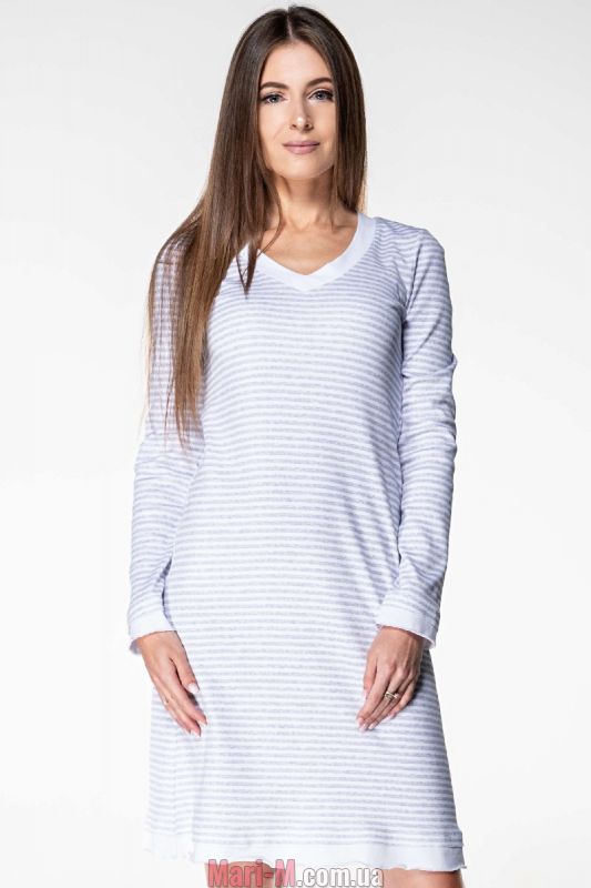 Хлопковая ночная сорочка 1104 Wiktoria. Комфортная ночная сорочка из мягкого и приятного хлопка с принтом в узкую полоску. Модель свободного кроя, немного расклешенная к низу, с длинными прямыми рукавами и V-образным вырезом горловины. Подол, вырез и низ рукавов отделаны широким однотонным кантом. Состав: 95% хлопок, 5% эластан.