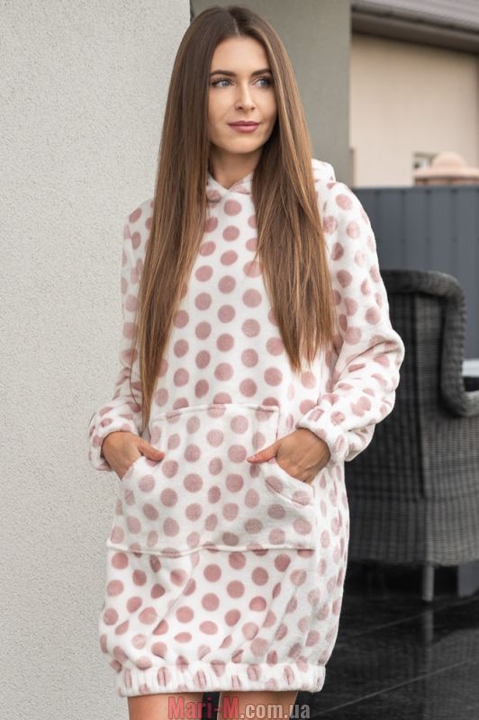 Флисовая туника 1404 Wiktoria. Теплая домашняя туника из мягкого пушистого флиса с принтом в крупный горох. Модель свободного кроя, с капюшоном и карманом-кенгуру, длинные рукава и низ изделия на широкой резинке. Состав: 100% полиэстер. Угги в комплект не входят. Их можно приобрести по ссылке ниже на странице, в товарах Для комплектации.