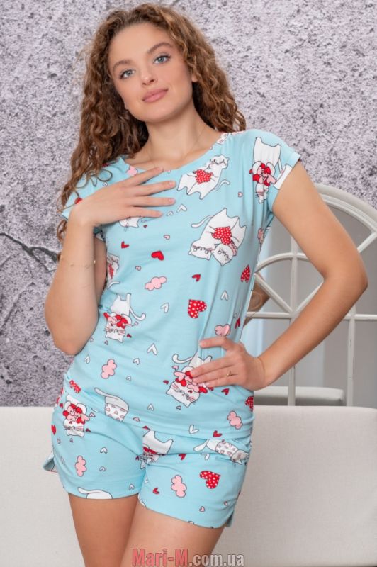 Бирюзовая хлопковая пижама с шортами 0003-13 Bahar. Пижама выполнена из очень мягкого и приятного хлопкового трикотажа с забавным принтом с изображением влюбленных котиков. В комплект входит футболка с короткими цельнокроеными рукавами и шорты на широкой мягкой резинке в поясе. Неглубокий круглый вырез горловины и рукава отделаны широким кантом. Шорты с боковыми карманами и небольшими разрезами по бокам. Состав: 95% хлопок, 5% эластан.
