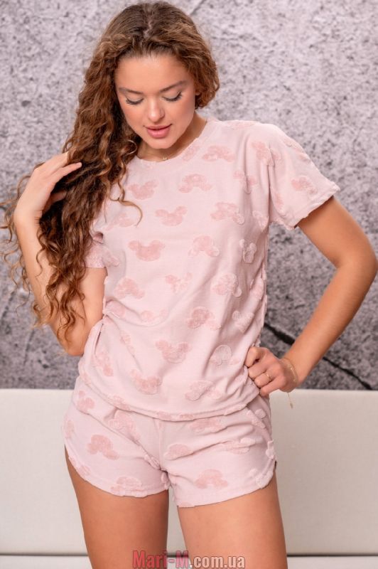 Пудровая хлопковая пижама с велюровым узором 0033-3 Bahar. Пижама выполнена из очень мягкого и приятного хлопкового трикотажа с фактурным велюровым узором. В комплект входит свободная футболка с короткими цельнокроеными рукавами и шорты на широкой мягкой резинке в поясе. Футболка с неглубоким круглым вырезом горловины. Шорты с вырезами по бокам. Состав: 95% хлопок, 5% эластан.