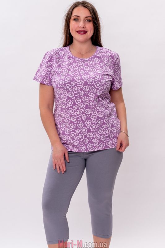 Сиреневая хлопковая пижама с бриджами 0203-4 Bahar. Пижама выполнена из очень мягкого и приятного хлопкового трикотажа. В комплект входит футболка с цветочным принтом и однотонные бриджи. Футболка с короткими рукавами и неглубоким круглым вырезом горловины. Состав: 95% хлопок, 5% эластан.