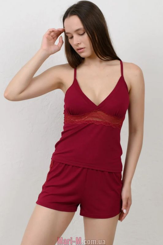 Пижама из вискозы с кружевом 1151-92 N.EL. Пижама выполнена из мягкого вискозного трикотажа. В комплект входит майка на тонких бретелях и шорты на мягкой резинке в поясе. Майка с мягкими треугольными чашечками и глубоким V-образным вырезом декольте, под грудью декорирована кружевной вставкой. Бретели перекрещиваются на спинке, образуя небольшой вырез в форме капли. Шорты украшены кружевом по бокам. Состав: 96% вискоза, 4% эластан.