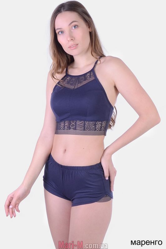 Пижама из вискозы с ажурными вставками 1171-1-92 N.EL. Пижама выполнена из мягкого вискозного трикотажа. В комплект входит топ на тонких регулируемых бретелях и шорты. Топ в зоне декольте и по низу, шорты по бокам декорированы вставками из ажурного эластичного полотна. Состав: 92% вискоза, 8% эластан.