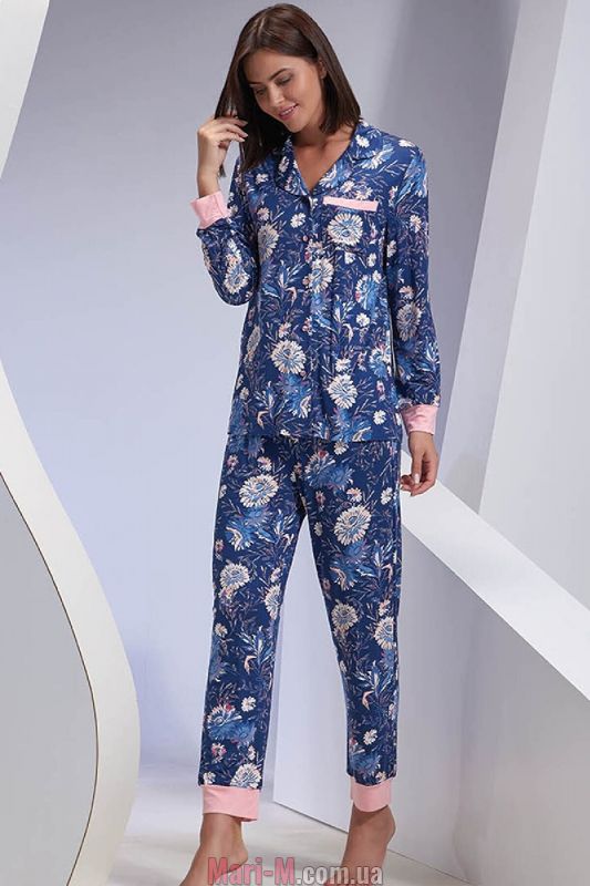Пижама из вискозы 12410 Sevim. Пижама выполнена из очень мягкого и приятного вискозного трикотажа с цветочным принтом. В комплект входит рубашка с длинными рукавами и брюки. Рубашка с фигурным отложным воротником, застегивается на пуговицы спереди, декорирована накладным карманом на груди. Рукава и штанины с однотонными манжетами. Состав: 95% вискоза, 5% эластан.