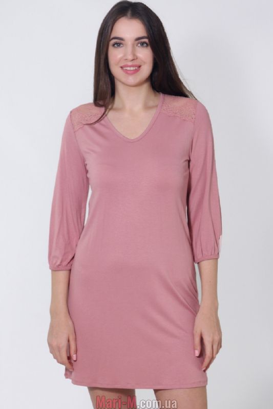 Ночная сорочка из вискозы 1260-92 N.EL. Ночная сорочка из нежного и приятного вискозного трикотажа. Модель свободного кроя, рукава ¾ с резинкой по низу. Декорирована вставками из эластичного ажурного полотна на плечах. Состав: 92% вискоза, 8% эластан.