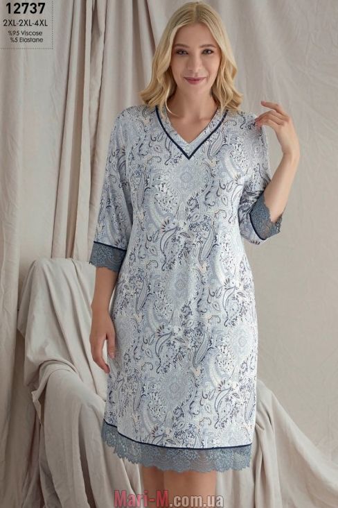 Ночная сорочка из вискозы с кружевом 12737 Sevim. Сорочка выполнена из мягкого и приятного вискозного трикотажа с набивным принтом, отделана узким кантом и украшена кружевом по низу рукавов и подолу. Модель прямого свободного кроя, с V-образным вырезом горловины и рукавами 3/4. Состав: 95% вискоза, 5% эластан.