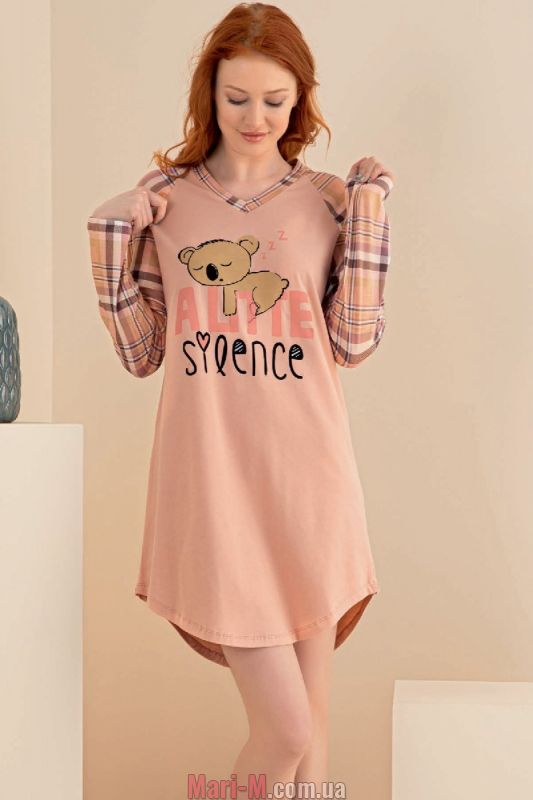 Хлопковая ночная сорочка 13020 Sevim. Сорочка выполнена из мягкого и приятного хлопкового трикотажа. Модель свободного кроя, с длинными рукавами и V-образным вырезом горловины, полочки снизу закруглены к бокам. Полочки выполнены из однотонного материала, рукава и отделка горловины – из ткани в клетку. Сорочка декорирована принтом на передней полочке. Состав: 93% хлопок, 7% эластан.