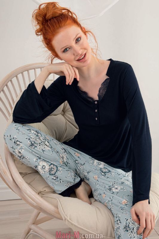 Пижама из вискозы с кружевом 13139 Sevim. Пижама выполнена из очень мягкого и приятного вискозного трикотажа. В комплект входит свободная однотонная футболка с длинными широкими рукавами и брюки с набивным цветочным принтом. Футболка с V-образным вырезом горловины, дополненным декоративной планкой и украшенным нежным цветочным кружевом. Брюки декорированы кружевом по низу. Состав: 95% вискоза, 5% эластан.