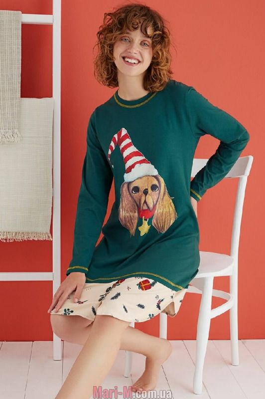Хлопковая ночная сорочка 13332 Sevim. Стильная ночная сорочка из мягкого и приятного однотонного хлопкового трикотажа, дополненная вставками из принтованного хлопкового полотна снизу. Модель свободного кроя, с длинными рукавами и неглубоким круглым вырезом горловины, декорирована контрастной отстрочкой и ярким принтом на передней полочке. Состав: 93% хлопок, 7% эластан.
