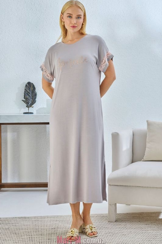 Длинная ночная сорочка из вискозы 14573 Sevim. Удобная ночная сорочка из очень мягкого и приятного вискозного трикотажа. Модель свободного кроя, с короткими цельнокроеными рукавами и неглубоким круглым вырезом горловины. Рукава декорированы кружевными вставками, передняя полочка украшена узором из стразов. В боковых швах разрезы. Состав: 95% вискоза, 5% эластан.