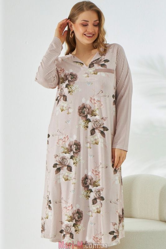 Ночная сорочка из вискозы 15043 Sevim. Ночная сорочка выполнена из приятного вискозного трикотажа в тонкую полоску с крупным цветочным принтом. Модель свободного кроя, с длинными рукавами-реглан и V-образным вырезом горловины. Состав: 95% вискоза, 5% эластан.