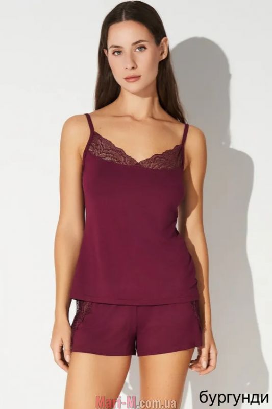 Пижама из вискозы с кружевом 1512-92 N.EL. Пижама выполнена из мягкого вискозного трикотажа. В комплект входит майка на тонких регулируемых бретелях и шорты. Майка декорирована кружевом по линии декольте, шорты украшены кружевными вставками по бокам. Состав: 96% вискоза, 4% эластан.