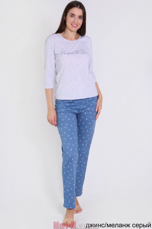 Пижама из хлопка 1528-12 N.EL. Пижама выполнена из мягкого высококачественного натурального хлопка. В комплект входит однотонная футболка с рукавами ¾ и прямые брюки с мелким набивным принтом. Футболка декорирована принтом-надписью на груди. Состав: 100% хлопок.