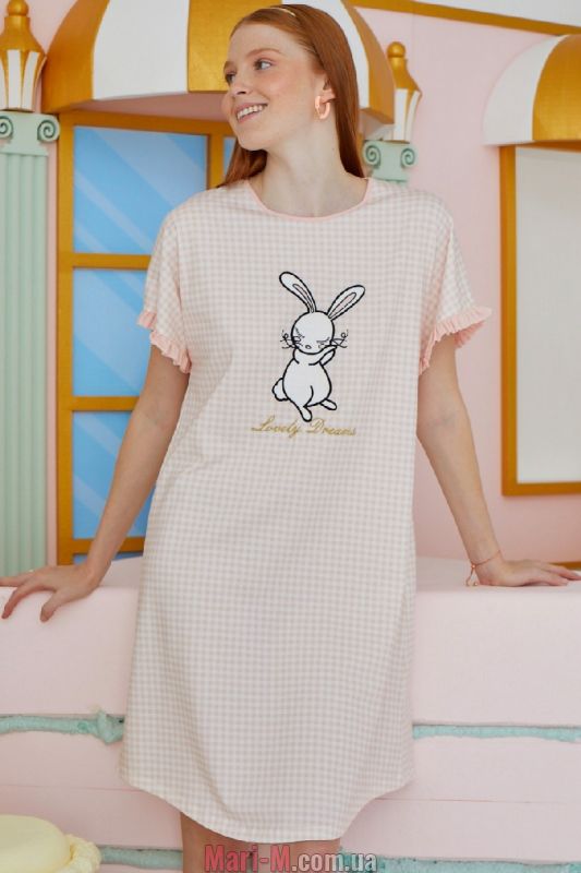 Ночная сорочка из хлопка 15555 Sevim. Удобная ночная сорочка из мягкого и приятного хлопкового трикотажа в мелкую клетку. Модель свободного кроя, с короткими цельнокроеными рукавами и неглубоким круглым вырезом горловины. Рукава отделаны тонкими оборками. Сорочка декорирована принтом на груди. Состав: 93% хлопок, 7% эластан.