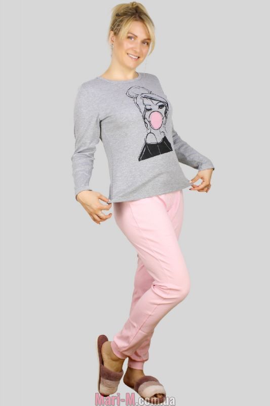 Хлопковая женская пижама 1561-19 N.EL. Пижама выполнена из приятного на ощупь плотного хлопкового трикотажа. В комплект входит меланжевая футболка с длинным рукавом и однотонные брюки с манжетами на штанинах. Футболка украшена принтом на передней полочке. Состав: 100% хлопок.