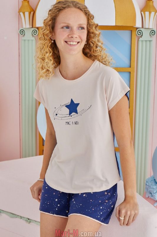Хлопковая пижама 15665 Sevim. Женская пижама из очень мягкого и приятного хлопкового трикотажа. В комплект входит футболка с короткими цельнокроеными рукавами и неглубоким круглым вырезом и шорты. Футболка выполнена из однотонного материала спереди, спинка и шорты изготовлены из такни с принтом в виде звездного неба. Передняя полочка декорирована принтом. Шорты с мягкой резинкой и шнурком на кулиске в поясе, по низу отделаны узким контрастным кантом. Состав: 93% хлопок, 7% эластан.