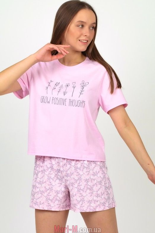 Пижама из хлопка 1588-12 N.EL. Легкая женская пижама из мягкого натурального хлопка. В комплект входит однотонная футболка с короткими рукавами и круглым вырезом горловины и шорты с набивным цветочным принтом. Футболка декорирована принтом на груди. Шорты на мягкой резинке в поясе. Состав: 100% хлопок.