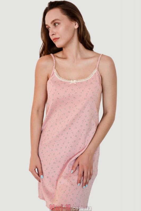 Хлопковая ночная сорочка на тонких бретелях 1619-19 N.EL. Сорочка выполнена из очень мягкого и приятного эластичного хлопкового трикотажа в рубчик, декорированного тонким принтом в виде точек и сердечек. Модель на тонких регулируемых бретелях. Зона декольте отделана кружевной тесьмой. Подол с волнистой отделкой плоским швом. Состав: 100% хлопок.