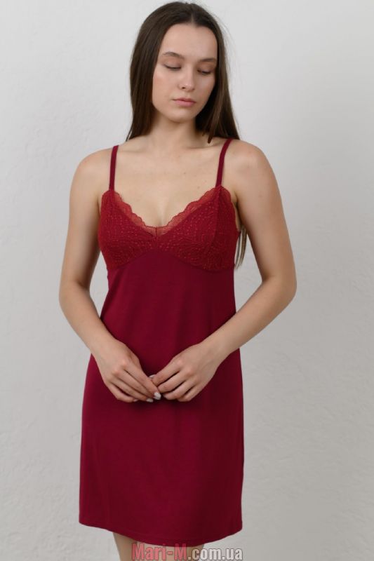 Ночная сорочка из вискозы с кружевом 1628-92 N.EL. Ночная сорочка выполнена из мягкого вискозного трикотажа, декорирована кружевом на спинке. Мягкие отрезные чашечки сверху покрыты кружевом. Модель на тонких регулируемых бретелях. Состав: 96% вискоза, 4% эластан.
