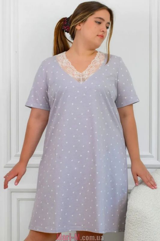 Хлопковая ночная сорочка с кружевом 1629-09 N.EL. Ночная сорочка выполнена из очень нежного и приятного трикотажного хлопкового полотна с мелким принтом в сердечки. Модель свободного кроя, с короткими рукавами, неглубокий V-образный вырез горловины отделан нежным цветочным кружевом. Состав: 100% хлопок.