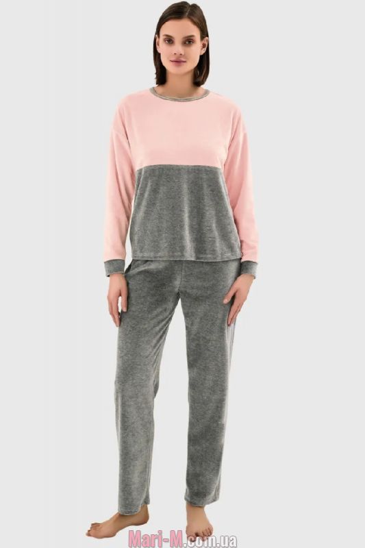 Велюровая пижама/комплект для дома 16987 Sevim. Пижама выполнена из приятного бархатистого велюрового материала с высоким содержанием хлопка и модала. В комплект входит серо-розовая кофта с длинными рукавами и прямые серые брюки на мягкой резинке в поясе. Рукава с пришивными манжетами и спущенной плечевой линией, неглубокий круглый вырез горловины отделан серым кантом. Костюм подходит как для сна, так и для отдыха дома. Состав: 40% модал, 40% хлопок, 20% полиэстер.