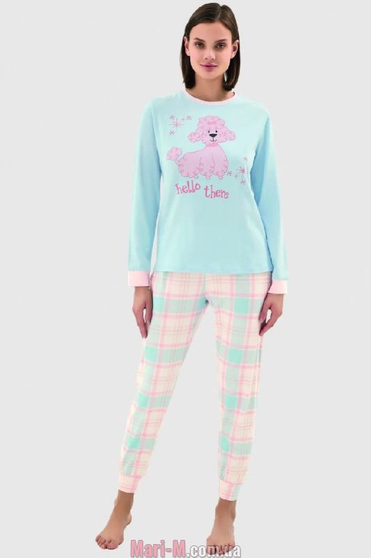Хлопковая женская пижама 16994 Sevim. Пижама выполнена из очень мягкого хлопкового трикотажа. В комплект входит бирюзовая кофта с длинными рукавами и брюки в крупную клетку в бирюзово-розовых тонах. Кофта украшена забавным принтом с изображением собачки на груди. Рукава с пришивными розовыми манжетами, неглубокий круглый вырез горловины отделан розовым кантом. Брюки заужены к низу, с мягкой резинкой в поясе. Штанины с манжетами. Состав: 95% хлопок, 5% эластан.