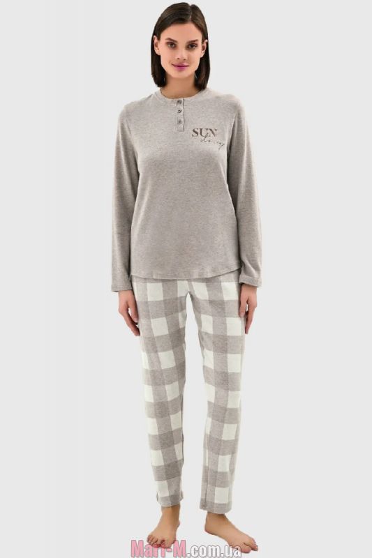 Пижама из вискозы 16996 Sevim. Пижама выполнена из плотного мягкого трикотажного полотна с высоким содержанием вискозы и хлопка. В комплект входит однотонная кофта с длинными рукавами и прямые брюки в крупную клетку. Кофта украшена небольшим принтом-надписью на груди, неглубокий круглый вырез горловины дополнен планкой на пуговицах. Брюки с мягкой резинкой в поясе. Состав: 60% вискоза, 25% хлопок, 10% полиэстер, 5% эластан.
