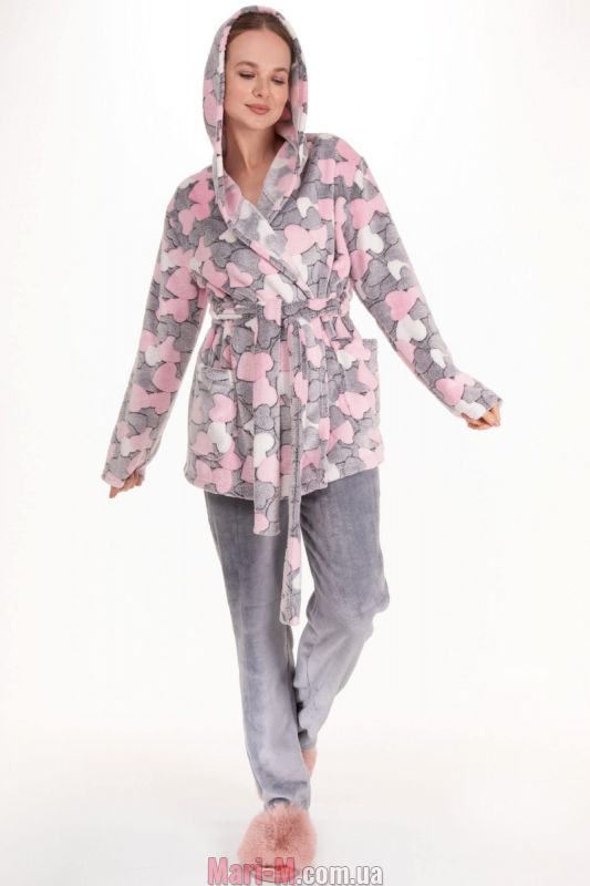 Комплект из велсофта 1705-42 N.EL. Комплект состоит из короткого халата с принтом в сердечки и однотонных прямых брюк на мягкой резинке в поясе. Халат на запах под пояс, длиной до бедра, с длинными рукавами, капюшоном и накладными карманами на уровне бедер. Комплект выполнен из мягкой и приятной трикотажной ткани велсофт (имеет очень мягкий, густой ворс). Состав: 100% полиэстер.
