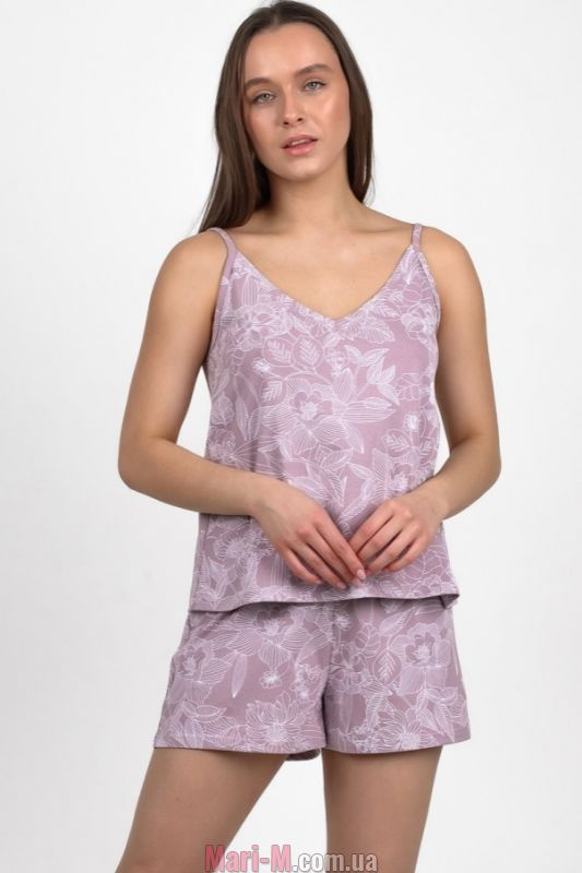 Хлопковая пижама 1723-09 N.EL. Пижама выполнена из очень мягкого и приятного хлопкового трикотажа с набивным цветочным принтом. В комплект входит майка на тонких регулируемых бретелях и шорты на мягкой резинке в поясе. Состав: 100% хлопок.