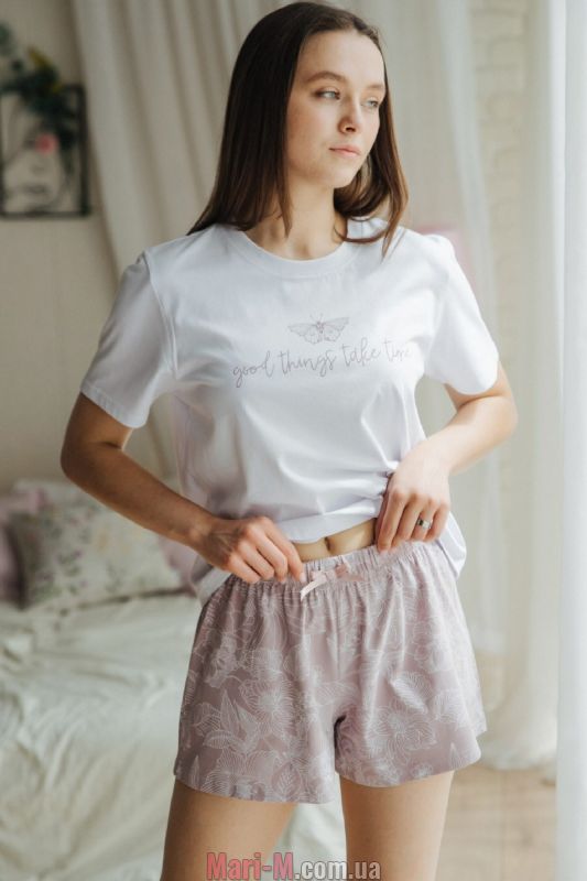 Женская пижама из хлопка 1732-09 N.EL. Удобная женская пижама из натурального хлопкового трикотажа. В комплект входит однотонная футболка с короткими рукавами и свободные короткие шорты с тонким цветочным принтом. Футболка с неглубоким круглым вырезом горловины, декорирована принтом на груди. Шорты на широкой мягкой резинке в поясе. Состав: 100% хлопок.