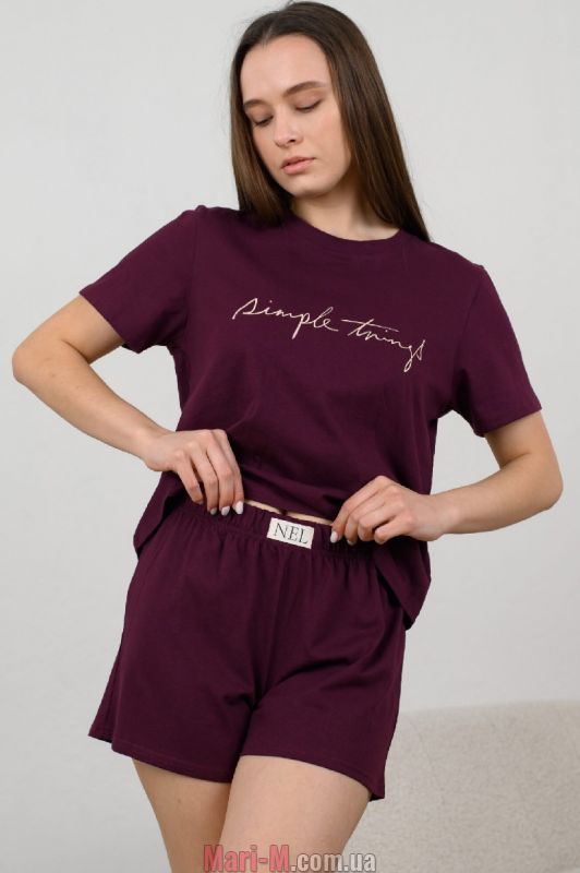 Хлопковая женская пижама 1757-12 N.EL. Пижама выполнена из мягкого и приятного хлопкового трикотажа. В комплект входит свободная футболка с короткими рукавами и неглубоким круглым вырезом горловины и шорты на широкой мягкой резинке в поясе. Футболка украшена контрастной надписью на груди. Состав: 100% хлопок.