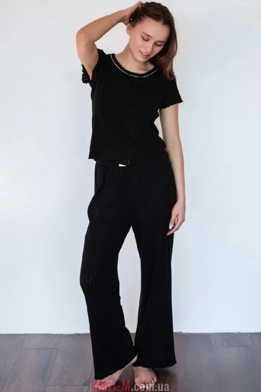 Хлопковая женская пижама с брюками 1771-71 N.EL. Пижама выполнена из очень мягкого и приятного хлопкового трикотажа в тонкий рубчик с перфорированным узором. В комплект входит футболка с короткими рукавами и свободные брюки на широкой мягкой резинке в поясе. Футболка с неглубоким круглым вырезом горловины, отделанным узким контрастным кантом. Низ рукавов, полочек и штанин с волнистой отделкой плоским швом. Состав: 95% хлопок, 5% эластан.