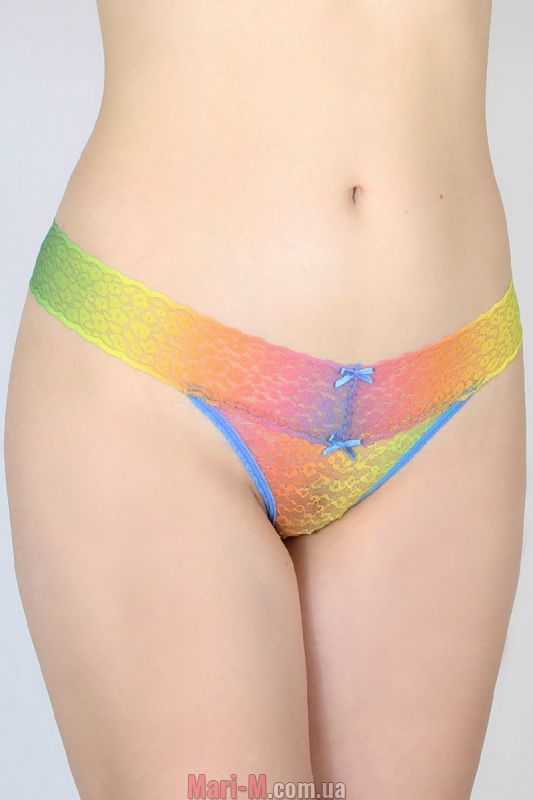 Кружевные стринги 20830 LaVivas. Трусики выполнены из эластичного кружевного полотна в яркой многоцветной расцветке. Украшены миниатюрными атласными бантиками на передней детали. Заниженная линия талии. Хлопковая ластовица. Упаковка из 2-х штук. В упаковке трусы одинаковые. Цена указана за упаковку. Состав: 90% полиэстер, 5% эластан, 5% хлопок.