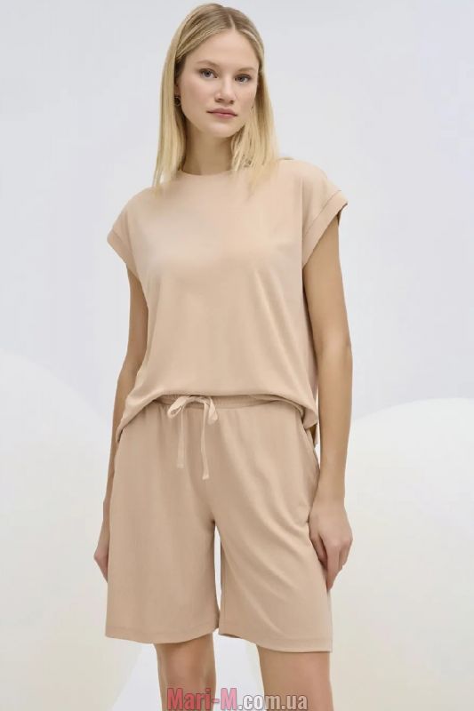 Женский домашний костюм из модала с шортами 21377 Sevim. Стильный домашний костюм из очень мягкого и приятного трикотажного полотна с высоким содержанием модала. В комплект входит футболка с короткими цельнокроеными рукавами и прямые шорты. Футболка свободного кроя, с неглубоким круглым вырезом горловины. Шорты с широким мягким поясом со шнурком на кулиске, по бокам карманы. Состав: 70% модал, 25% полиэтер, 5% эластан.