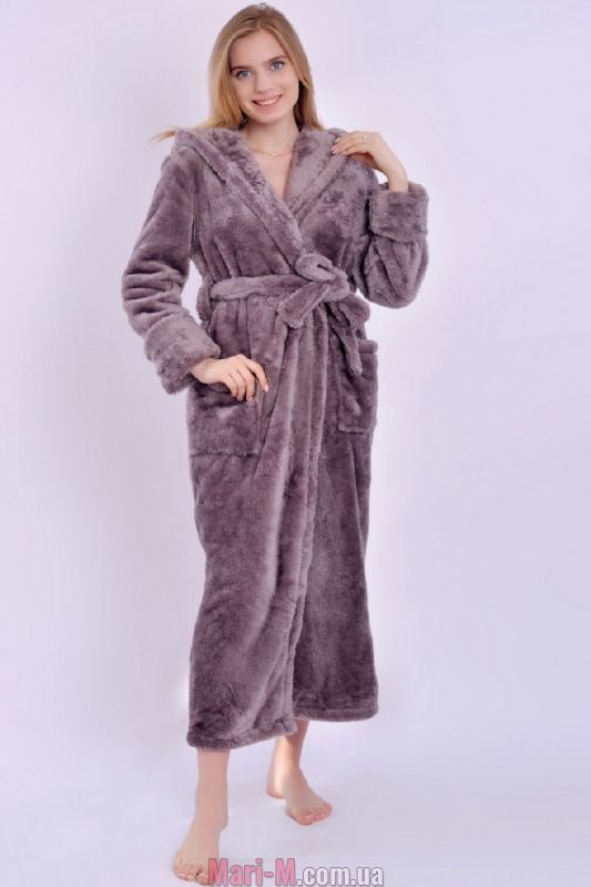 Кофейный теплый женский халат из велсофта 2300-2 Bahar. Уютный женский халат из теплого велсофта с мягким пушитым ворсом. Модель длиной до середины голени, на запах под пояс, с капюшоном и накладными карманами на уровне бедер, длинные рукава с отворотами. Состав: 100% полиэстер.