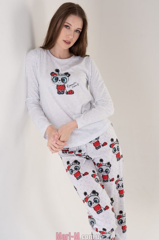 Хлопковая пижама 303246 Vienetta. Пижама выполнена из мягкого и приятного хлопкового трикотажа. В комплект входит однотонная кофта и брюки с забавным принтом в виде панд. Кофта с длинными рукавами и неглубоким круглым вырезом горловины, украшена принтом с изображением панды на груди. Брюки с широкой резинкой с завязками в поясе, штанины немного заужены к низу. Состав: 70% хлопок, 30% полиэстер.